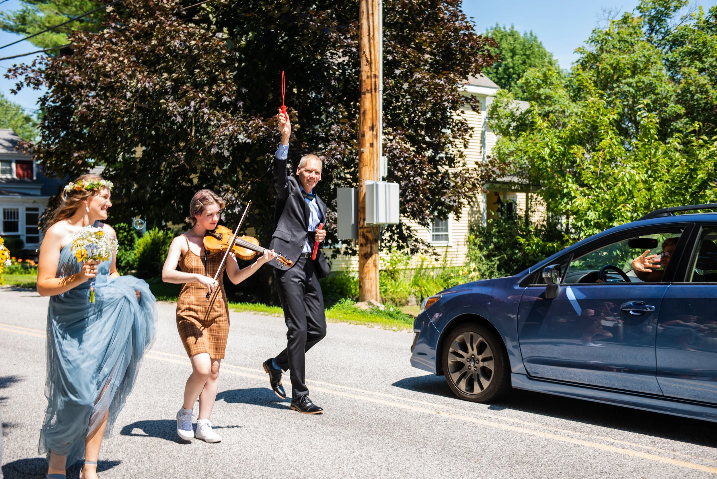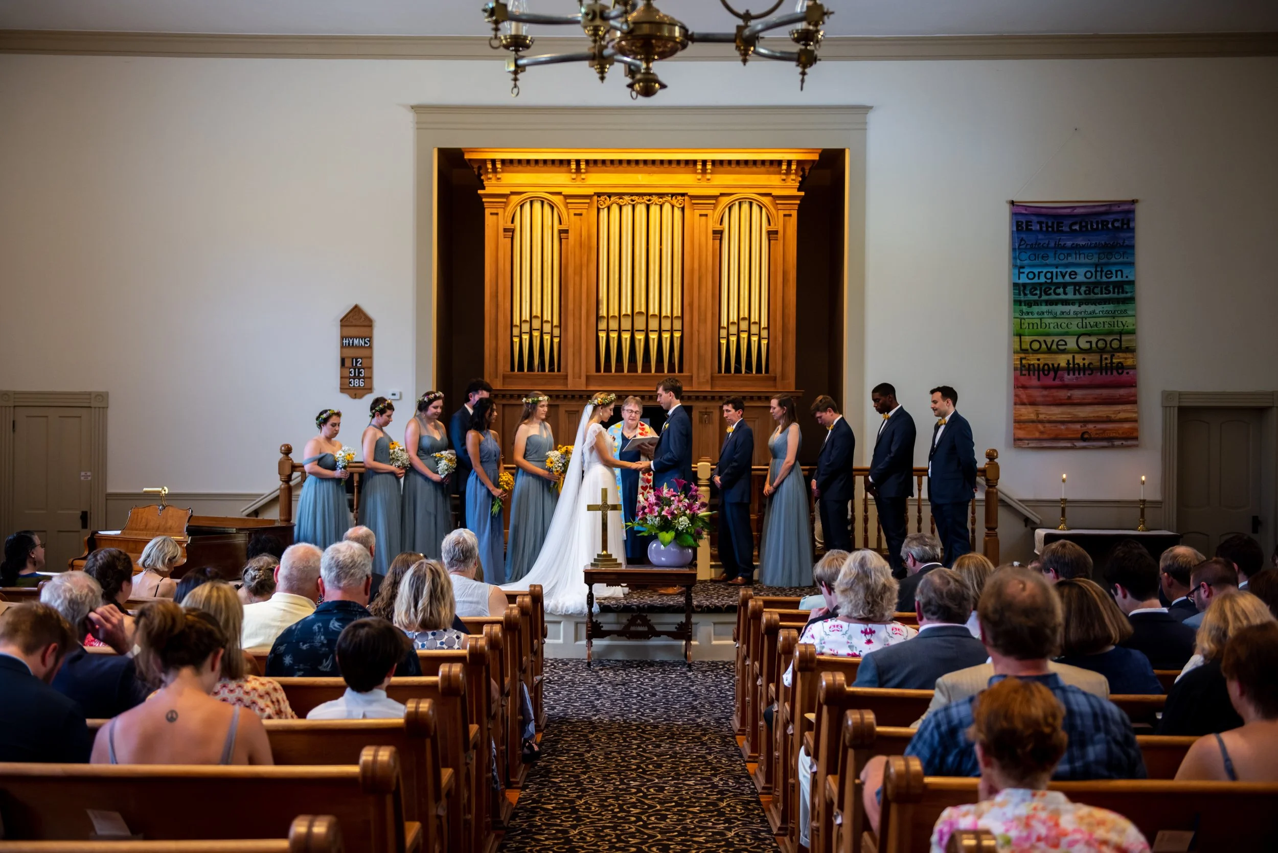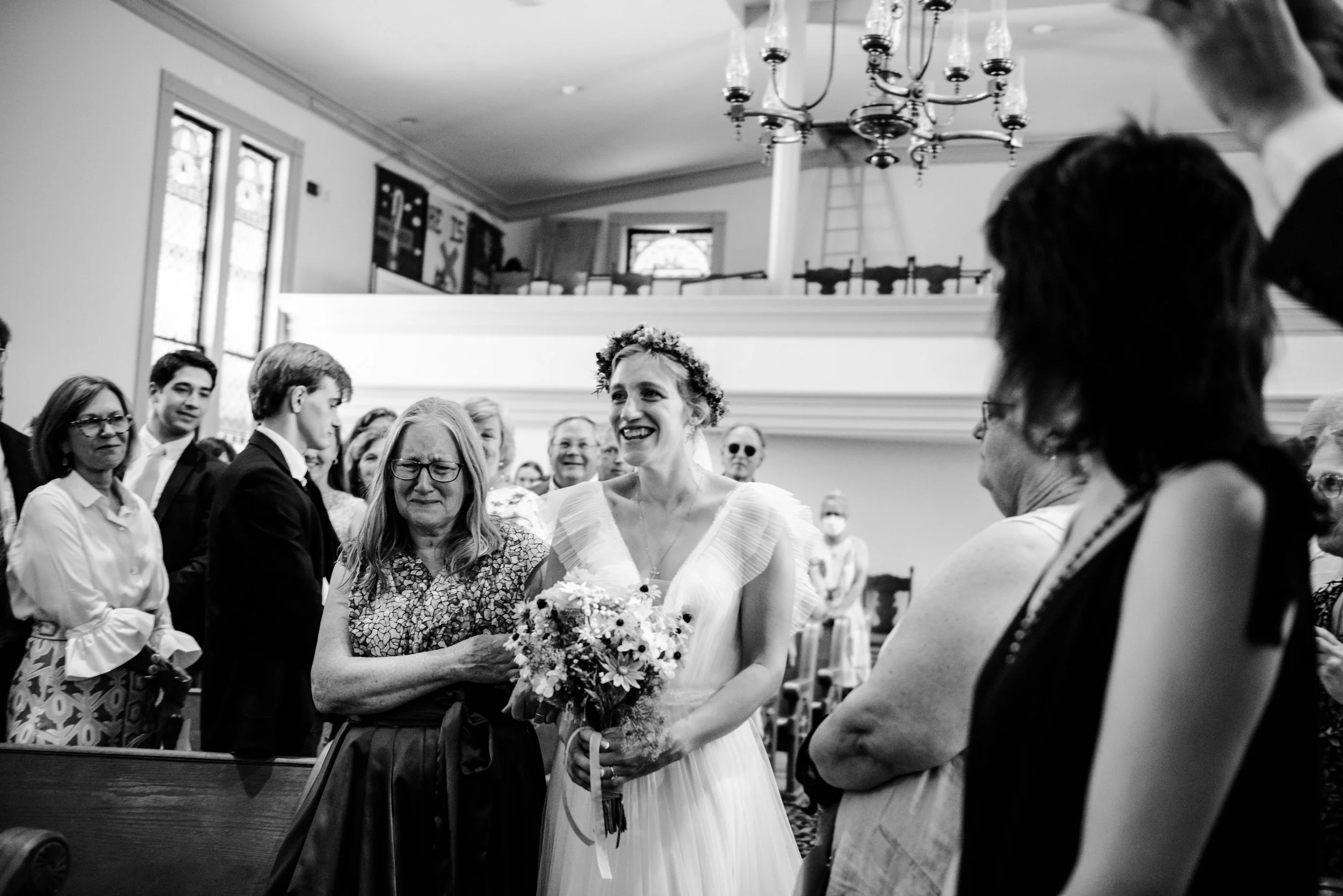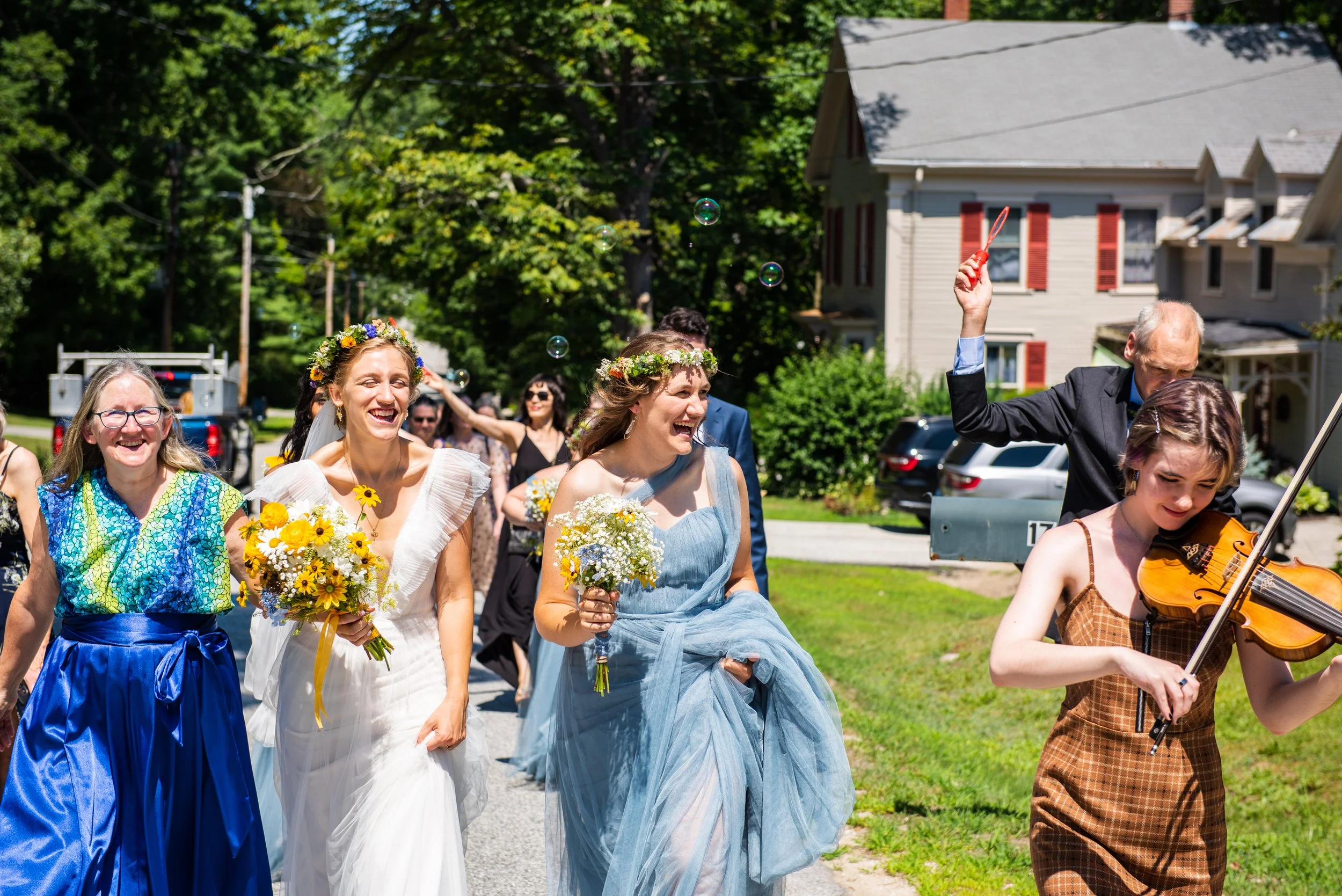 Once ready, the bridal party strode down Main Street in town for their brudsmarsch, a traditional Scandinavian bridal approach to the ceremony. There was music, there were bubbles, and there were many cars stopped in traffic to wave us along in congratulations. Then, Lydia and Roger tied the knot at the very sweet First Congregational Church of New Gloucester.