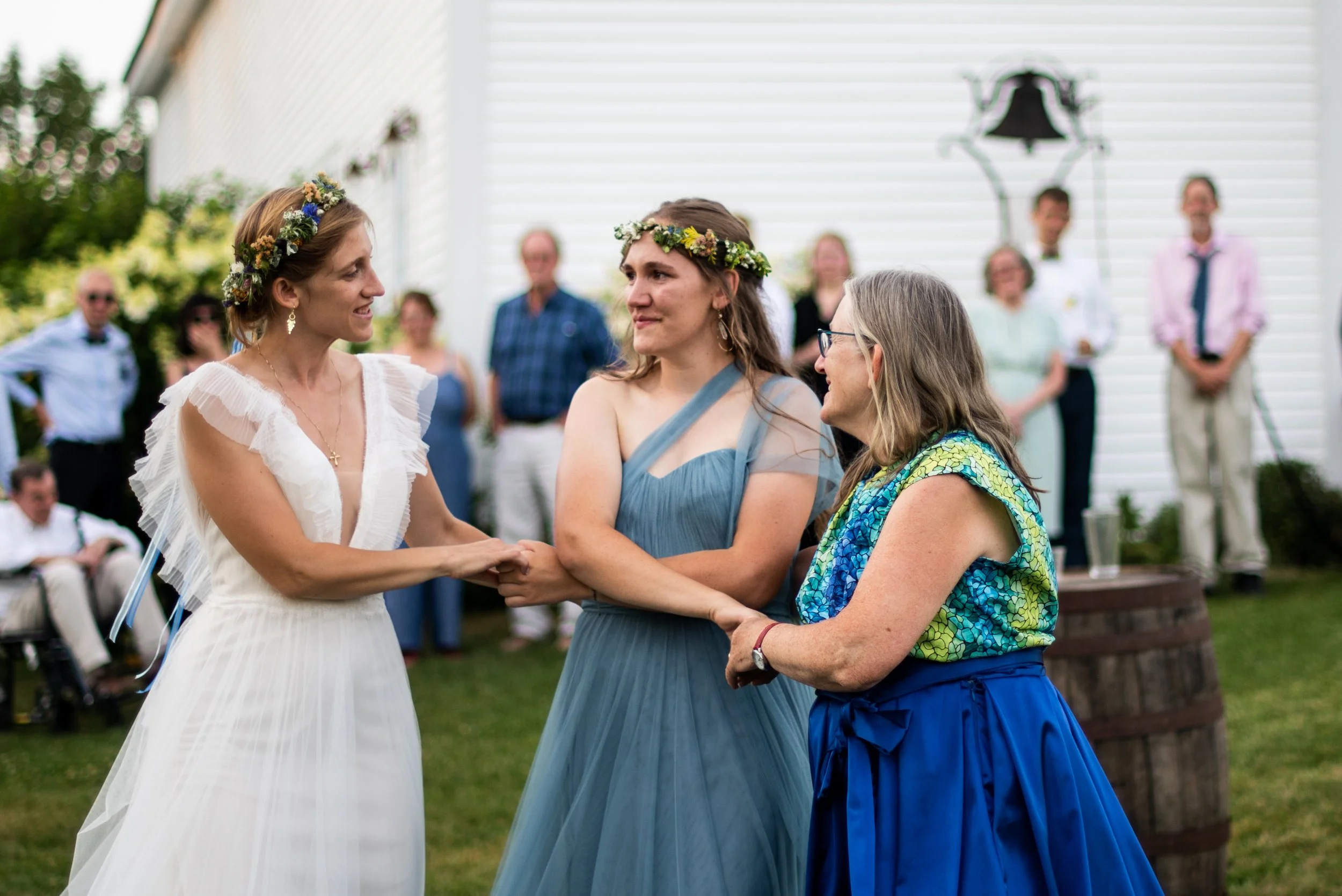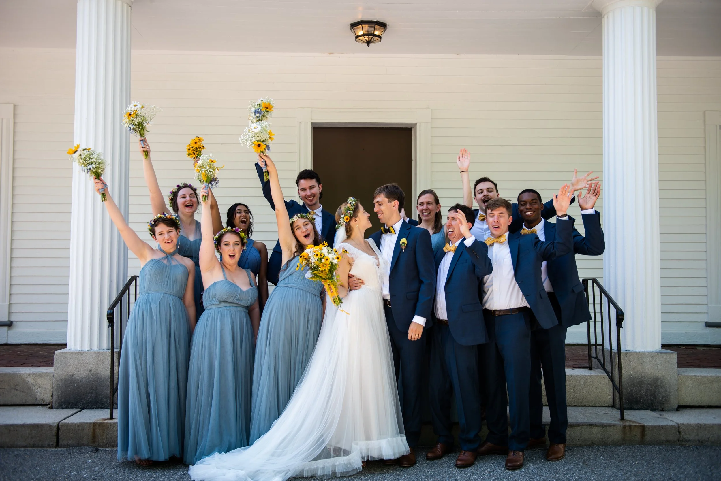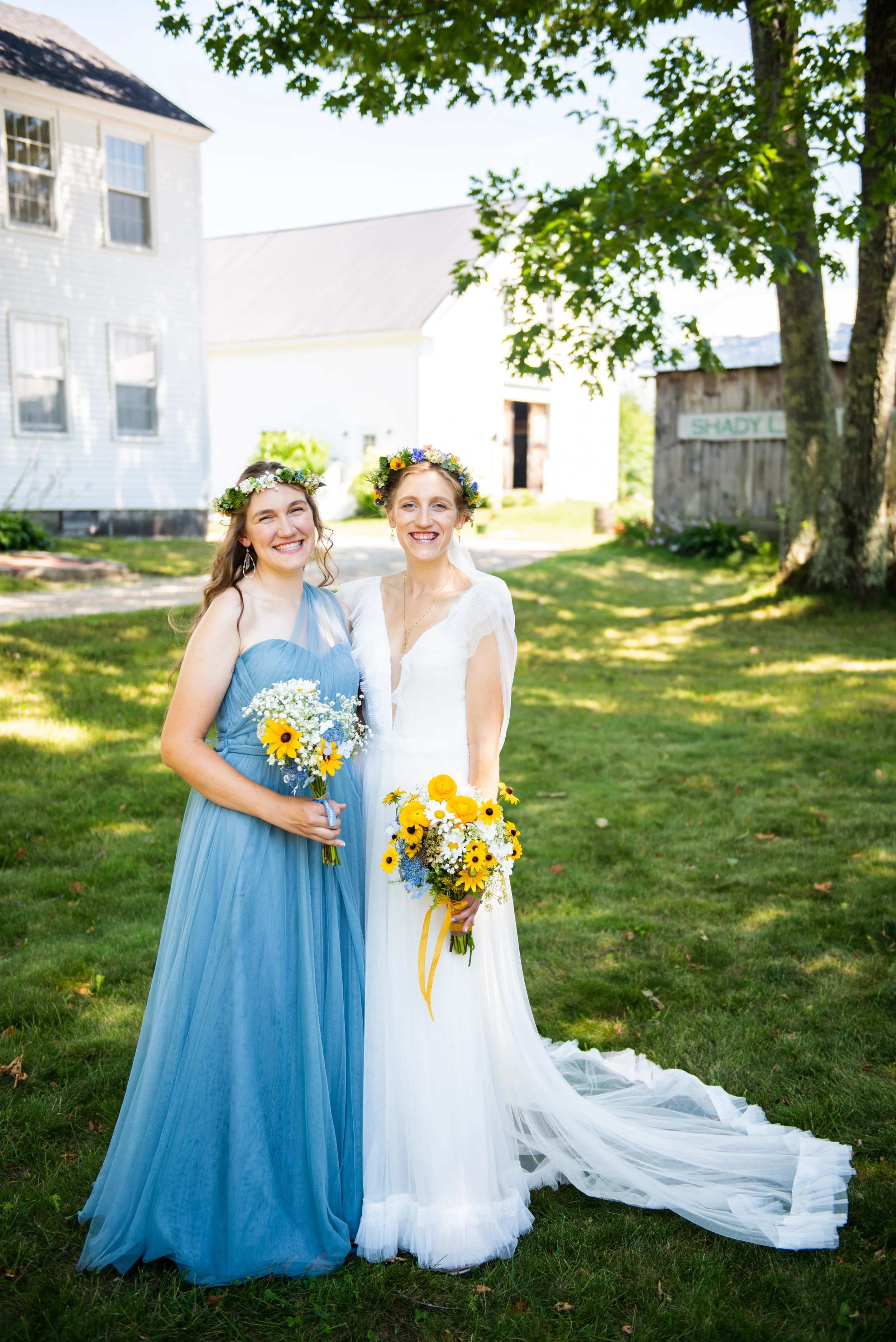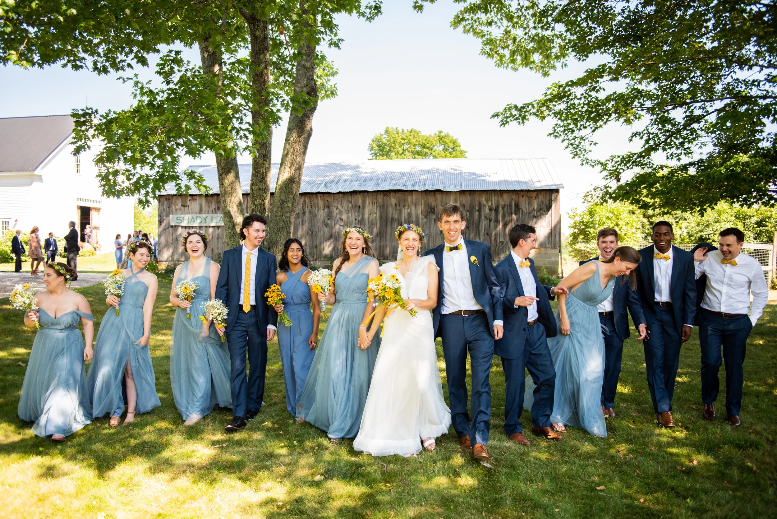 Once ready, the bridal party strode down Main Street in town for their brudsmarsch, a traditional Scandinavian bridal approach to the ceremony. There was music, there were bubbles, and there were many cars stopped in traffic to wave us along in congratulations. Then, Lydia and Roger tied the knot at the very sweet First Congregational Church of New Gloucester.