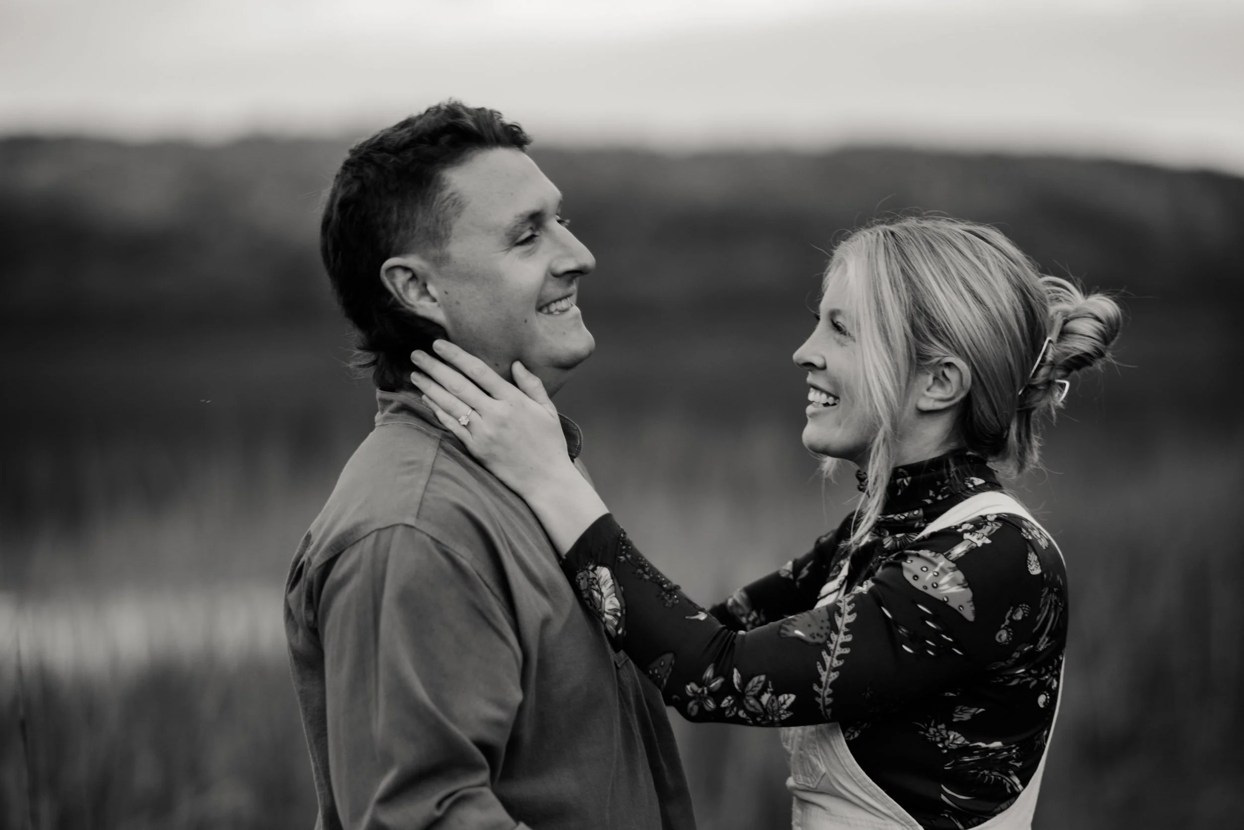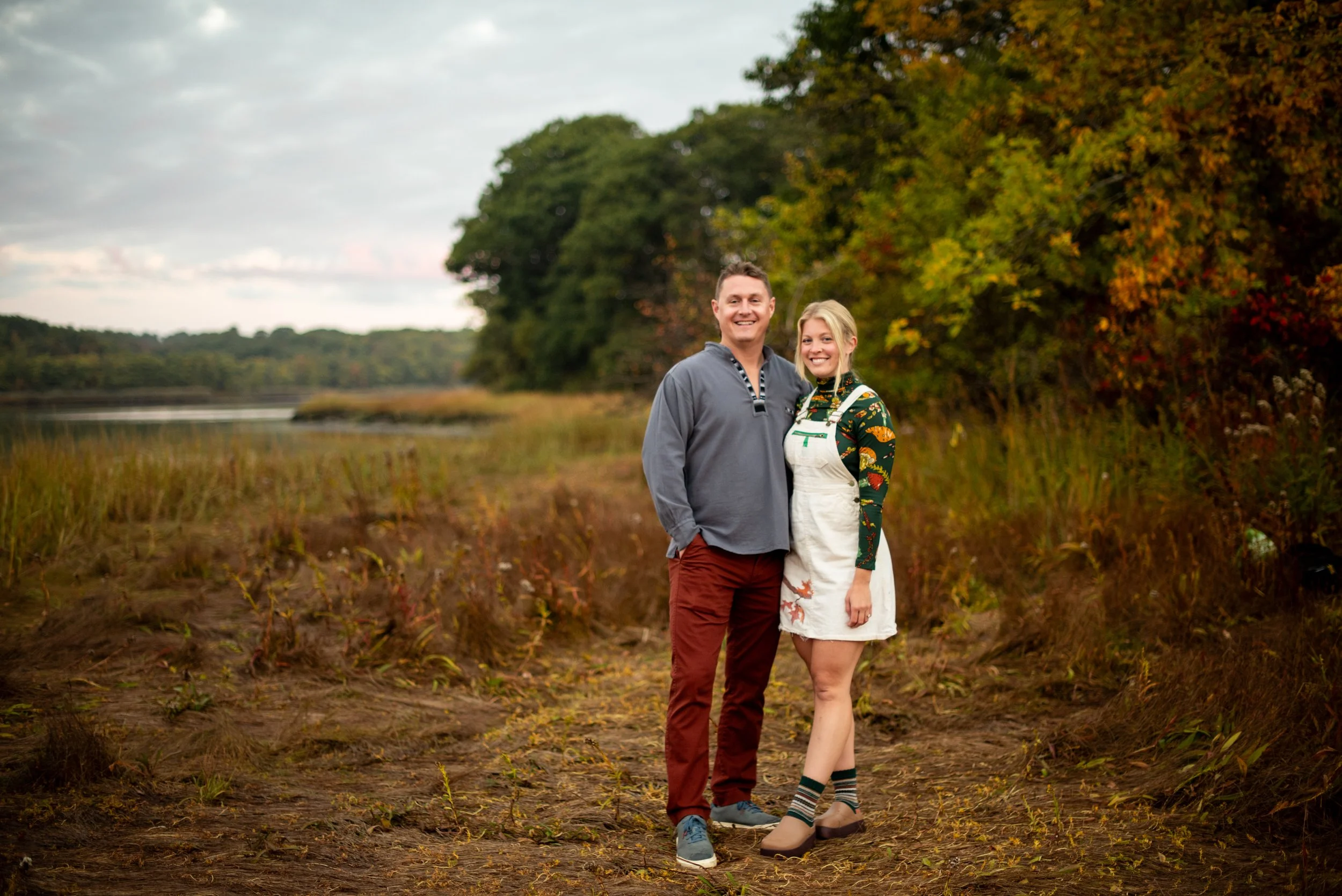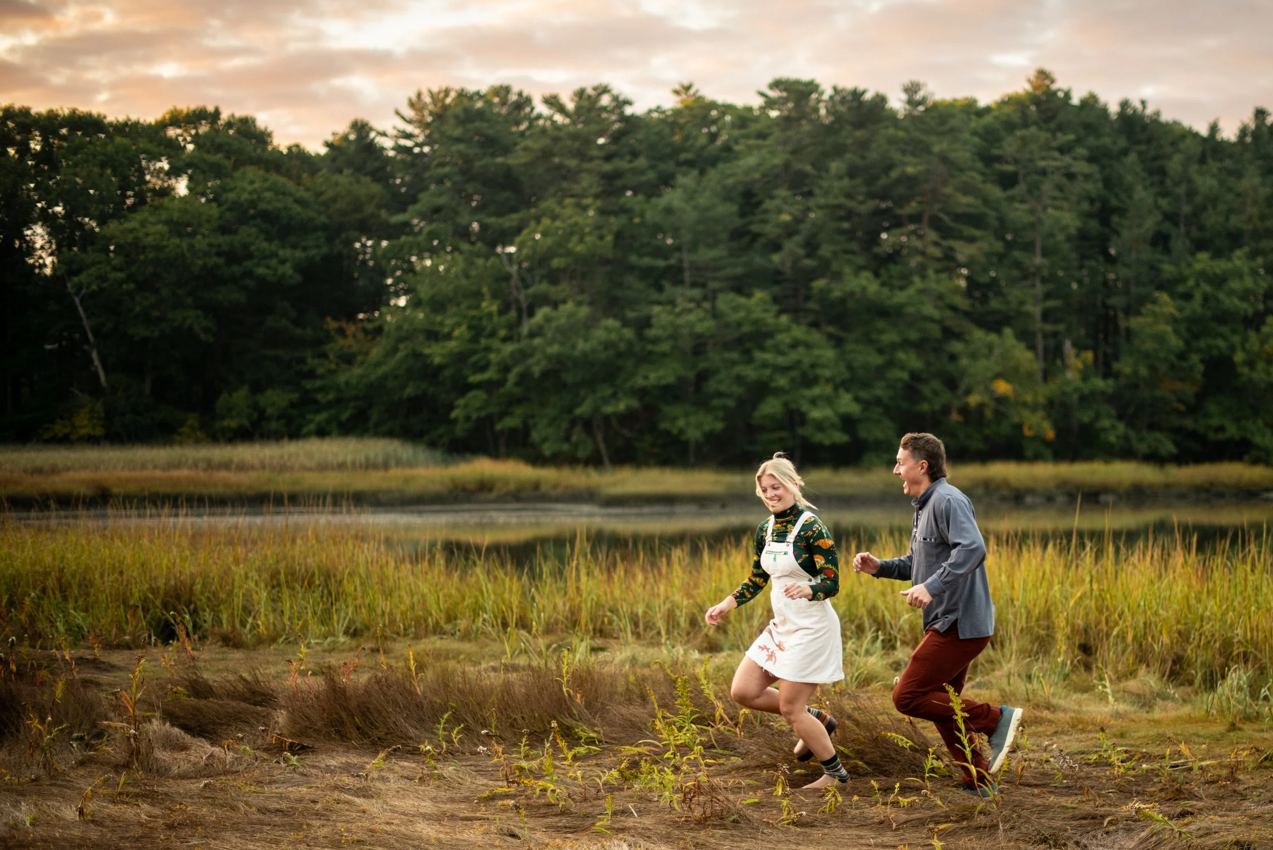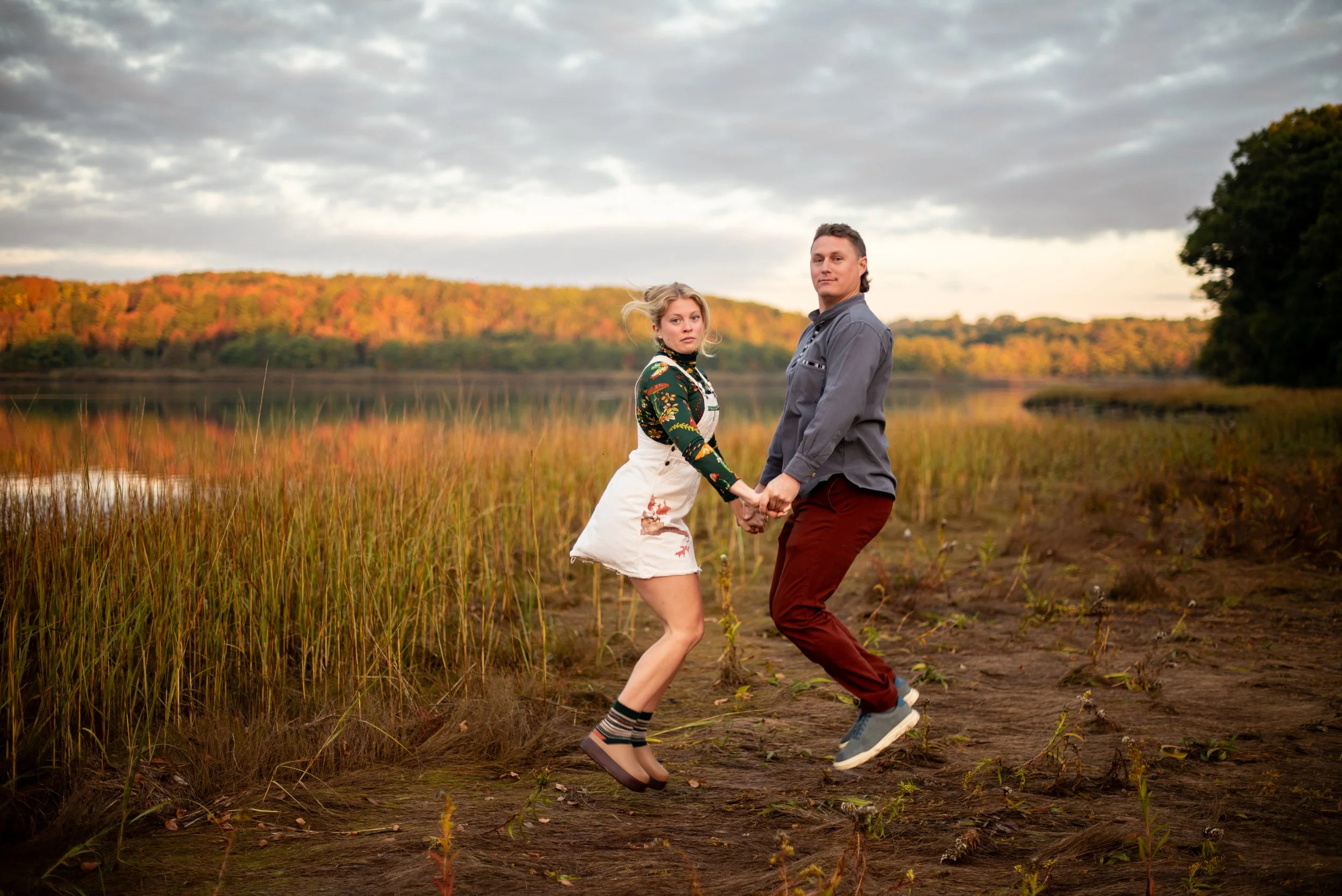 First and foremost, Mary is my oldest best friend and that made this engagement shoot special from the very start. Secondly, Mary and Sam are bold. They were dedicated to our sunrise timing for the photoshoot even though that meant meeting at 6AM on a Sunday. And, they were even willing to traipse out into the muddy, squishy marsh at the Maine Audubon at Gilsland Farm (the Audubon was a fitting start to the shoot for these avid birders). Third, they’re quirky. For the first half of the shoot, they rocked memorable tops with Mary in a mushroom print turtleneck and Sam in a notch-collar shirt. Fourth, they’re silly as heck. Some of their photo ideas included jumping together with deadpan faces, pretending to be predator and prey in a chase, pretending to spot each other in the wild. At one point when we were in downtown Portland (where the couple loves to explore), Mary unexpectedly but purposefully bit Sam’s finger and we all lost it laughing.