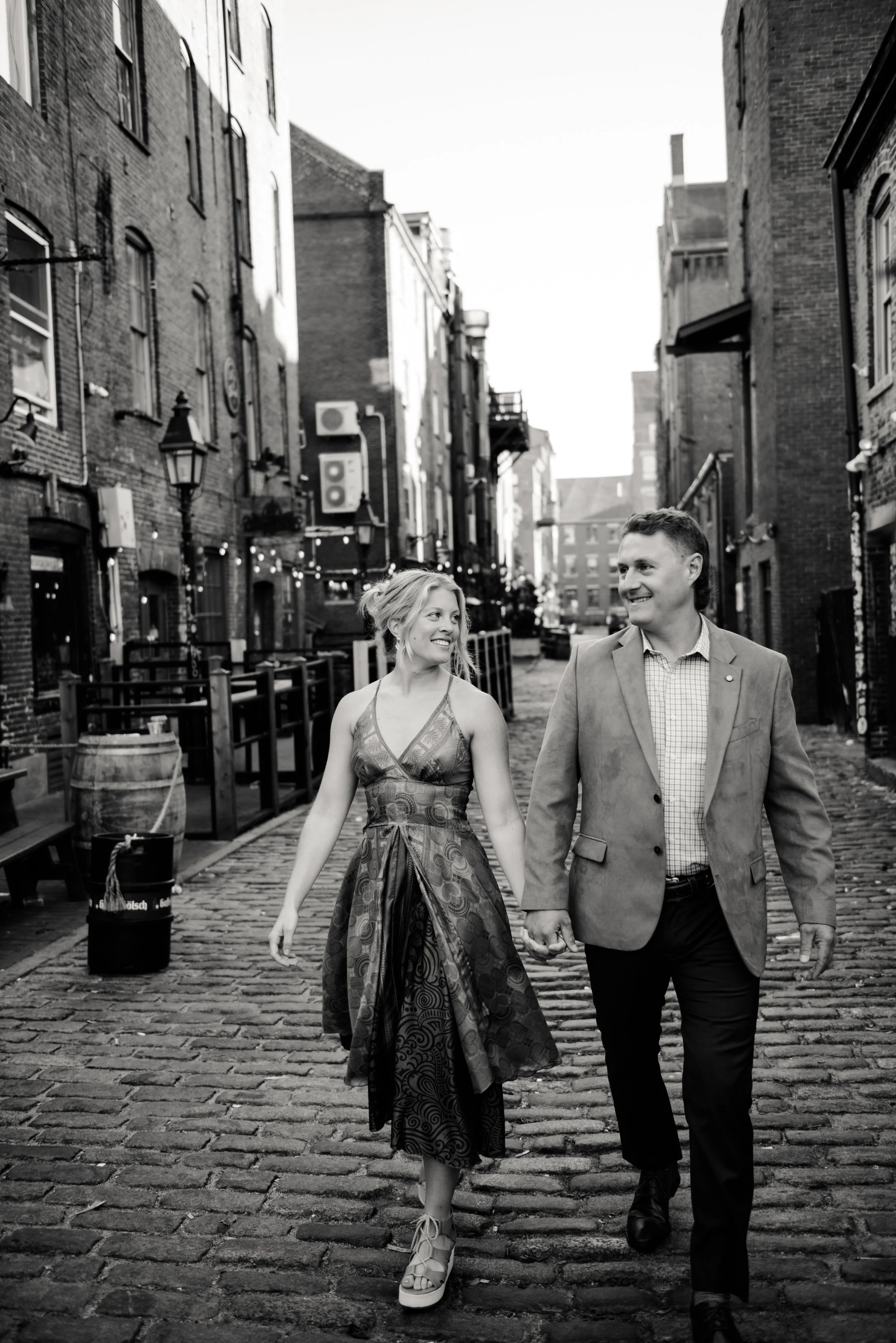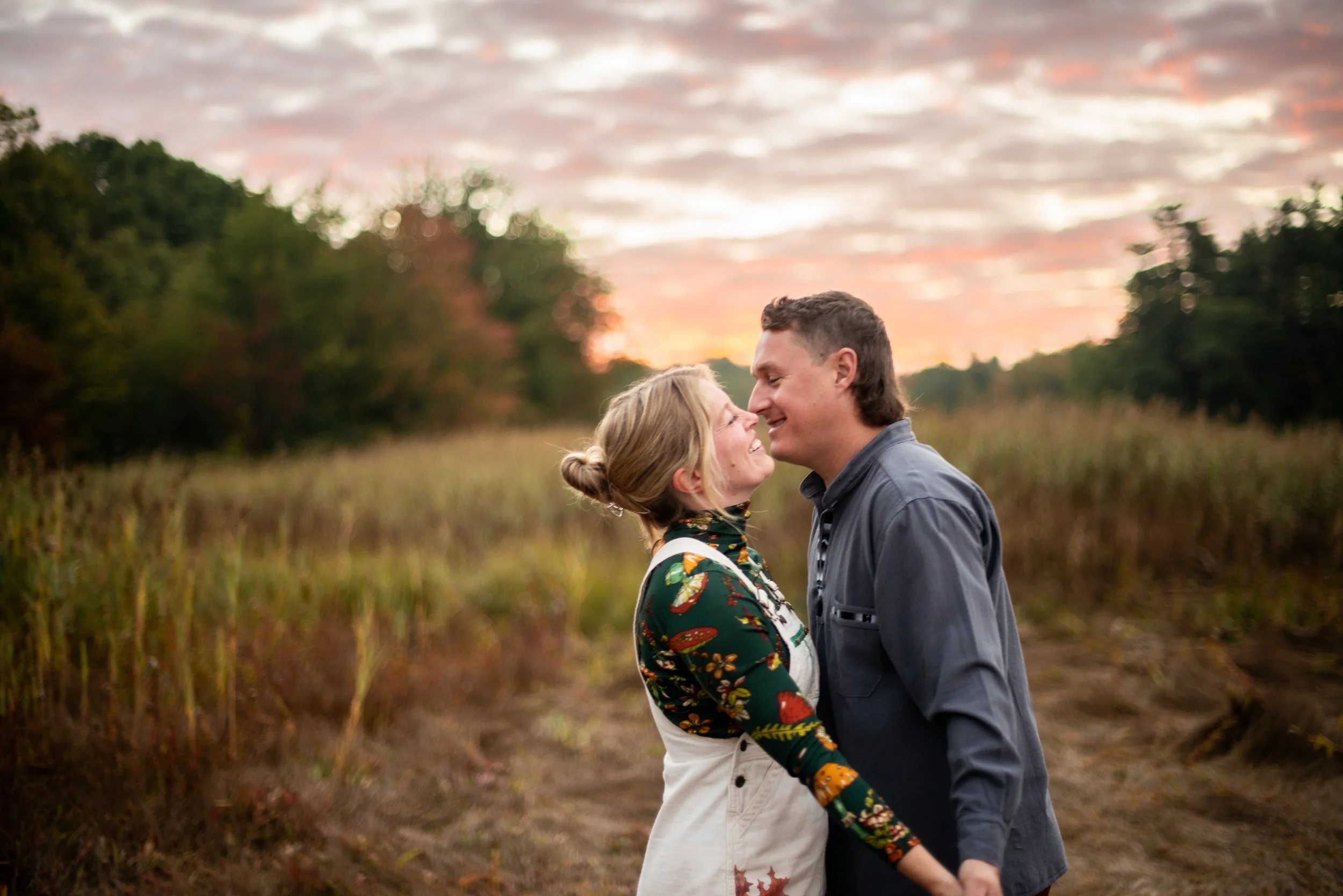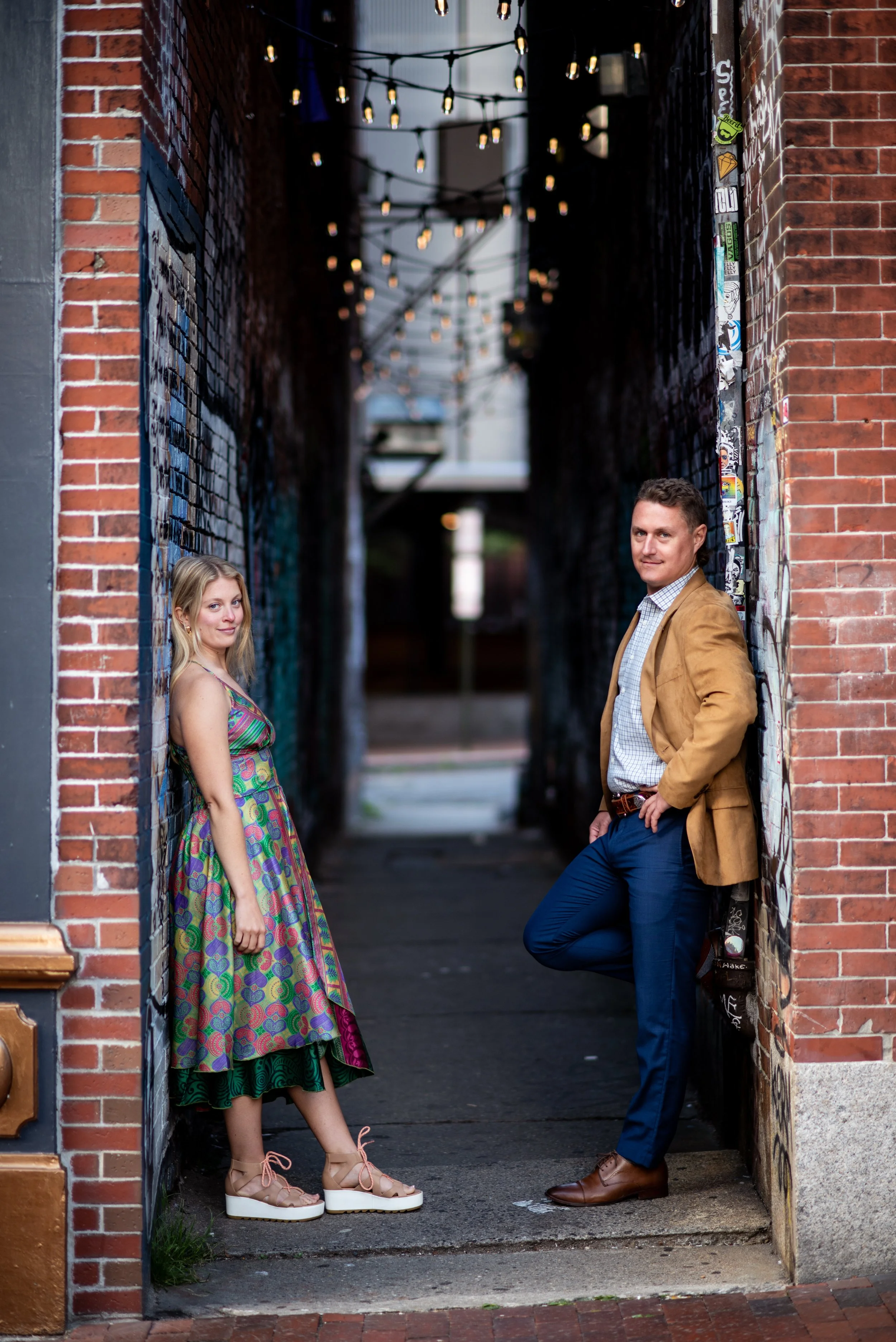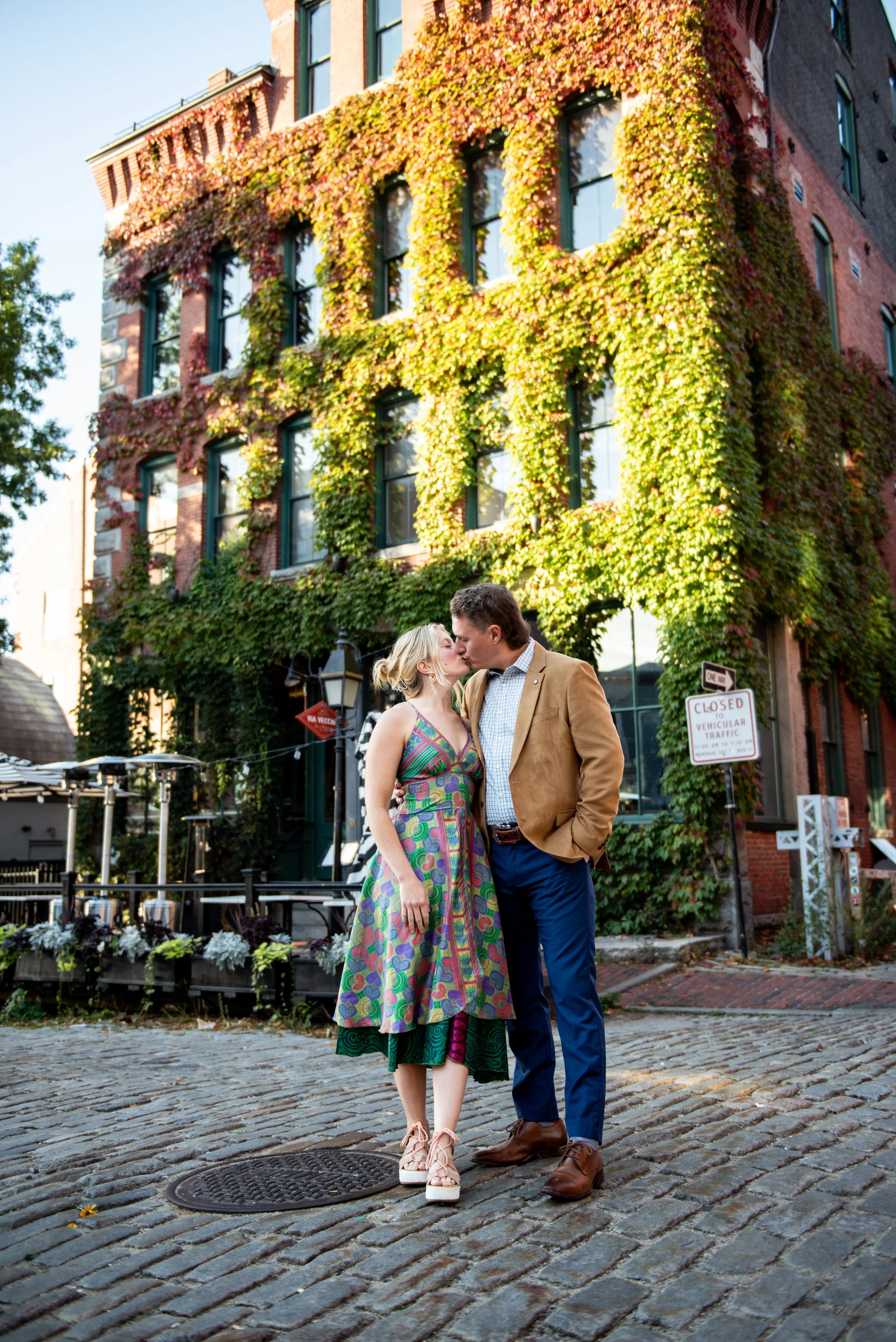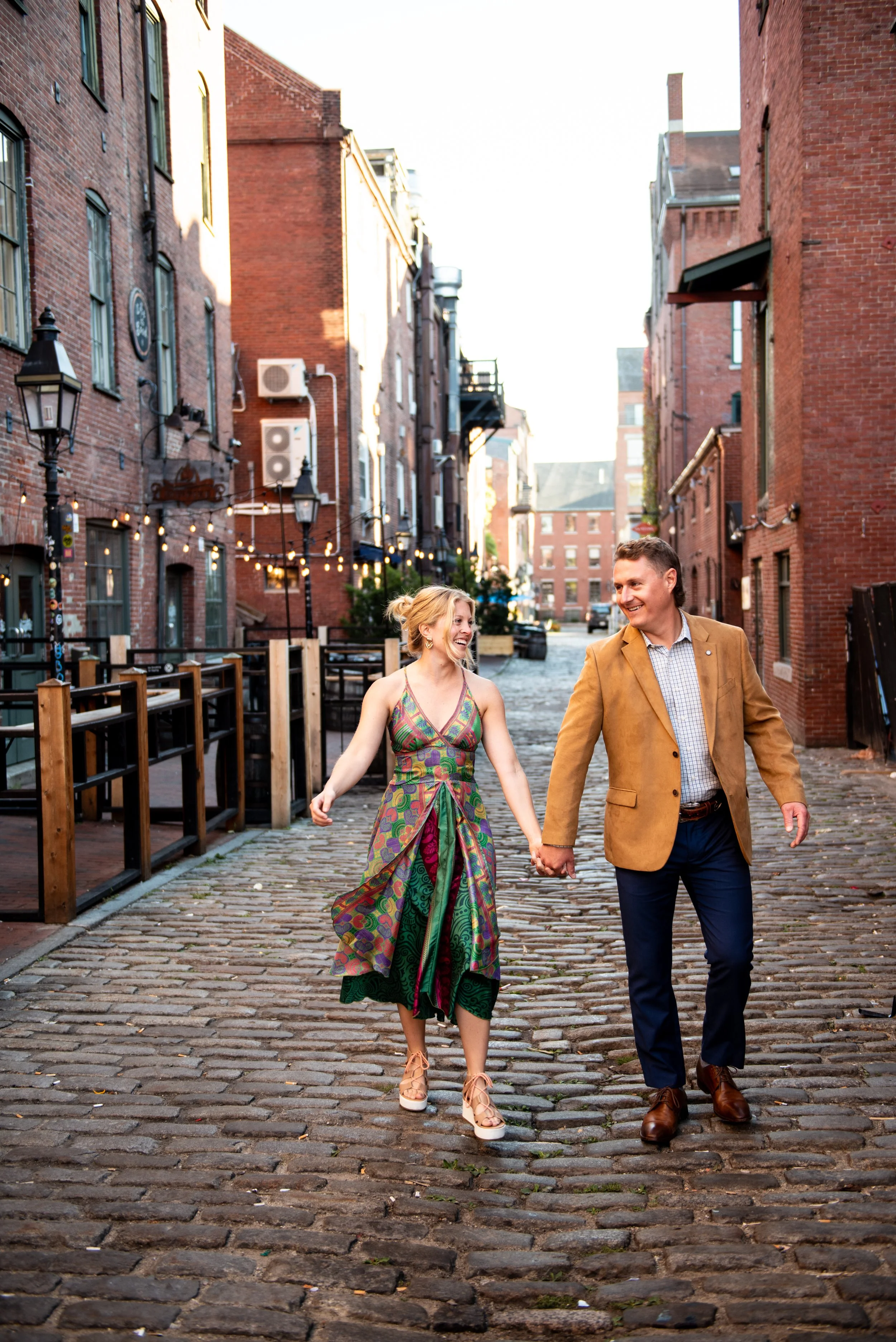 First and foremost, Mary is my oldest best friend and that made this engagement shoot special from the very start. Secondly, Mary and Sam are bold. They were dedicated to our sunrise timing for the photoshoot even though that meant meeting at 6AM on a Sunday. And, they were even willing to traipse out into the muddy, squishy marsh at the Maine Audubon at Gilsland Farm (the Audubon was a fitting start to the shoot for these avid birders). Third, they’re quirky. For the first half of the shoot, they rocked memorable tops with Mary in a mushroom print turtleneck and Sam in a notch-collar shirt. Fourth, they’re silly as heck. Some of their photo ideas included jumping together with deadpan faces, pretending to be predator and prey in a chase, pretending to spot each other in the wild. At one point when we were in downtown Portland (where the couple loves to explore), Mary unexpectedly but purposefully bit Sam’s finger and we all lost it laughing.