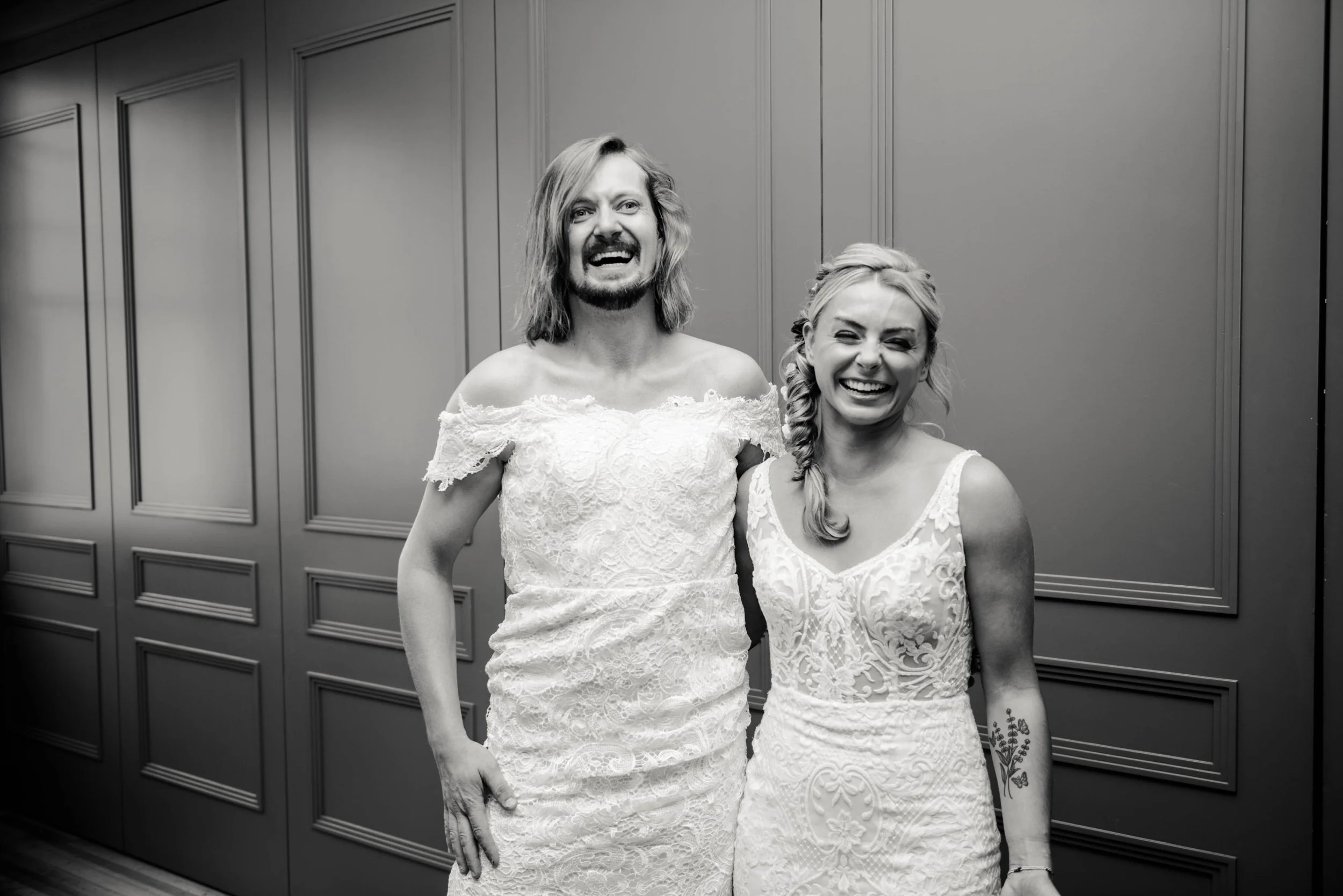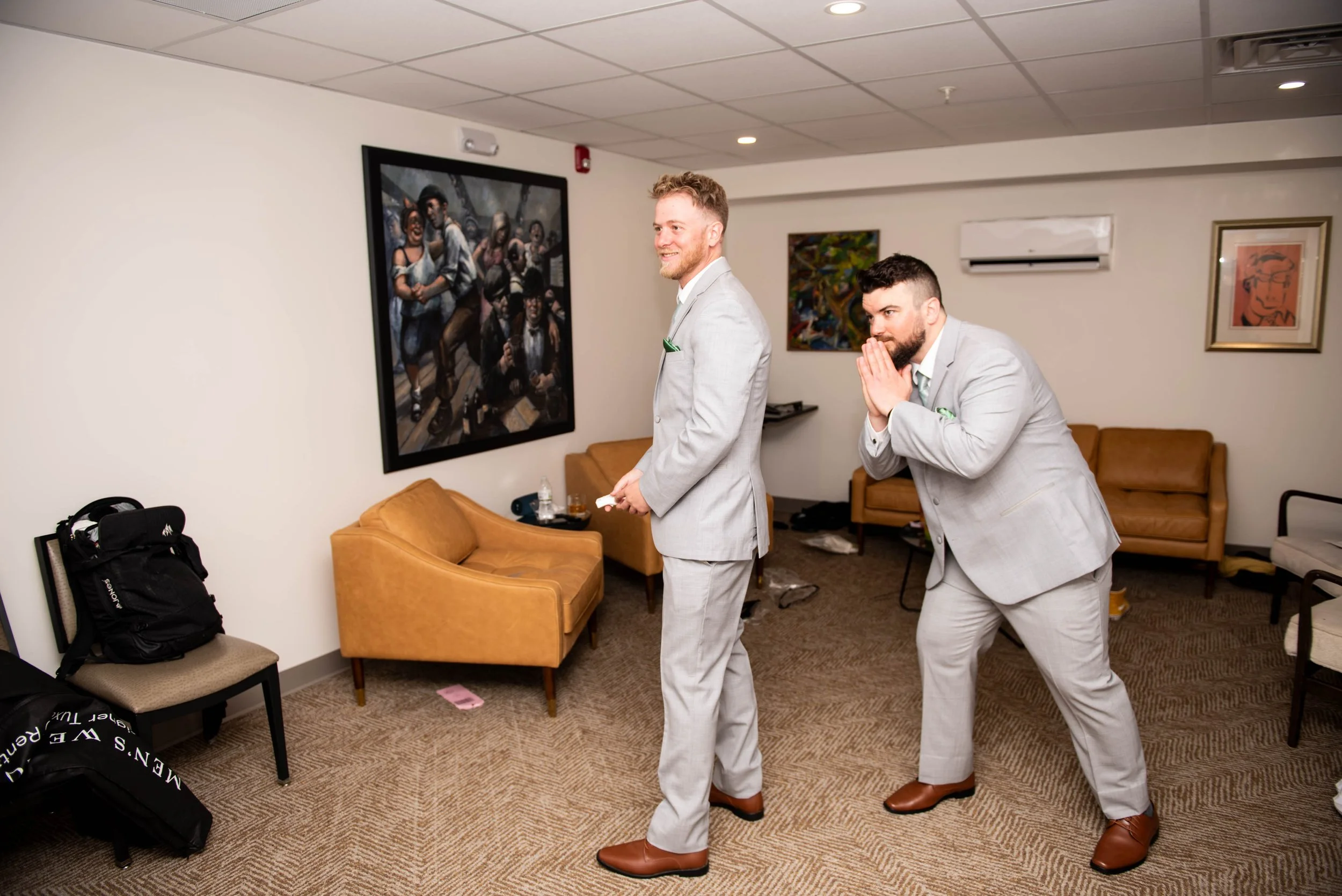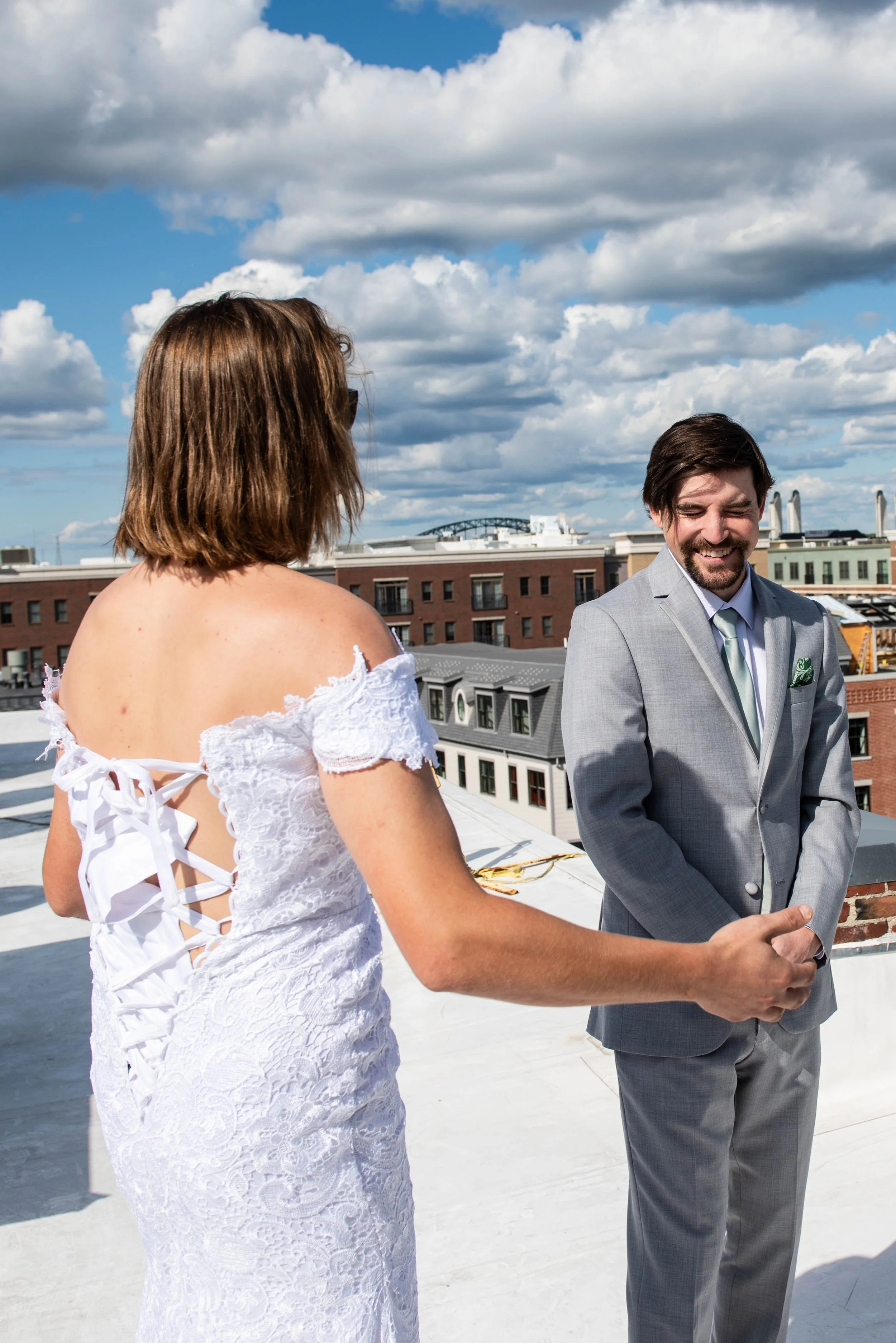 They started the day getting ready at Jimmy’s Jazz & Blues Club, with Aura Jade Beauty handling hair and makeup. Maddie was relaxed and surrounded by a crew that kept things light from the jump. Their first look took place on the roof of the club, where Tony’s best man pulled the best prank every by putting on a wedding dress and posing as Maddie when Tony first turned around. The rest of the wedding party was just dying with laughter. Finally, Maddie made her appearance for the real first look and it was so sweet. The excitement for the day just kept building!